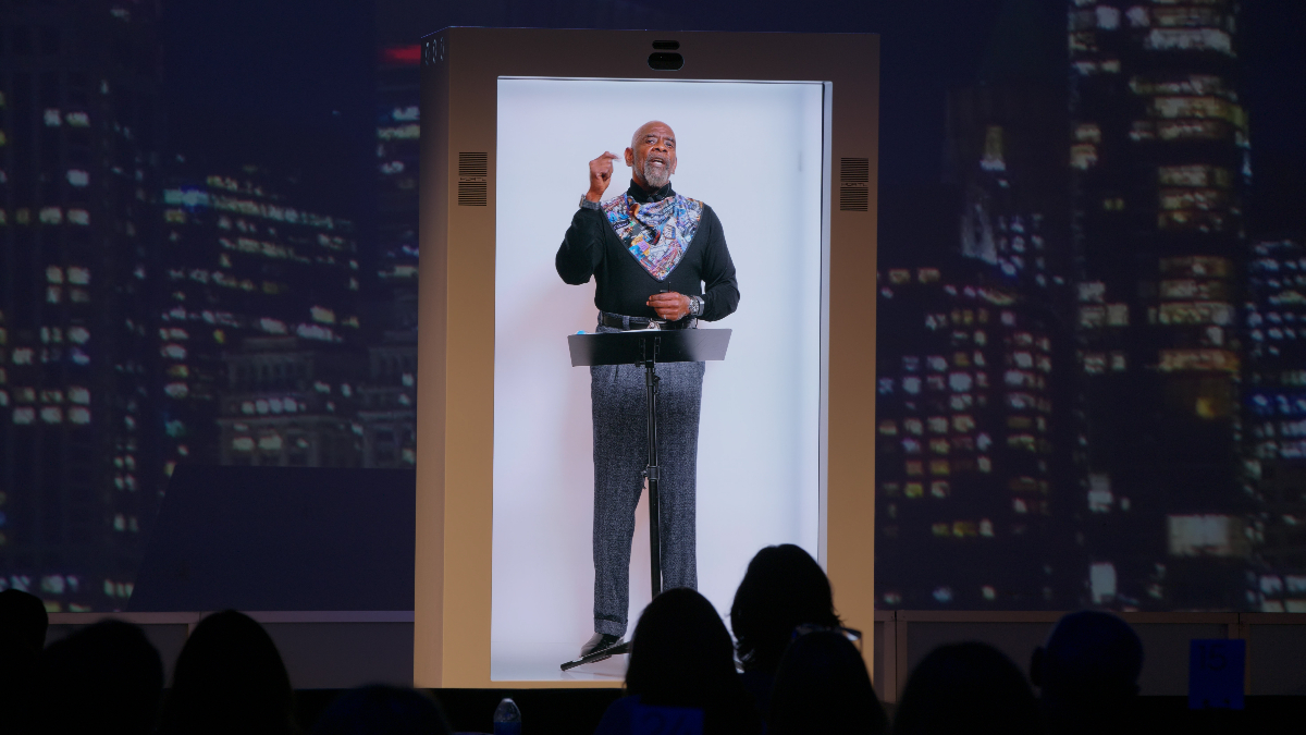 Chris Gardner being beamed into a PORTL unit to give his keynote to global hotel execs