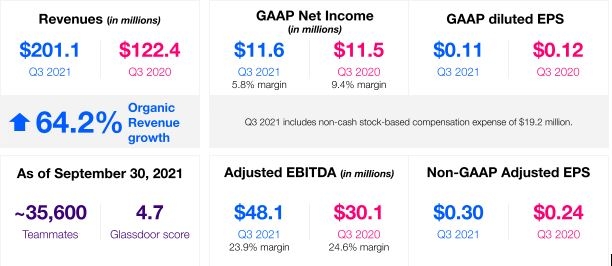 - Revenues were $201.1 million, representing 64.2% year-over-year organic growth compared to the third quarter of 2020.