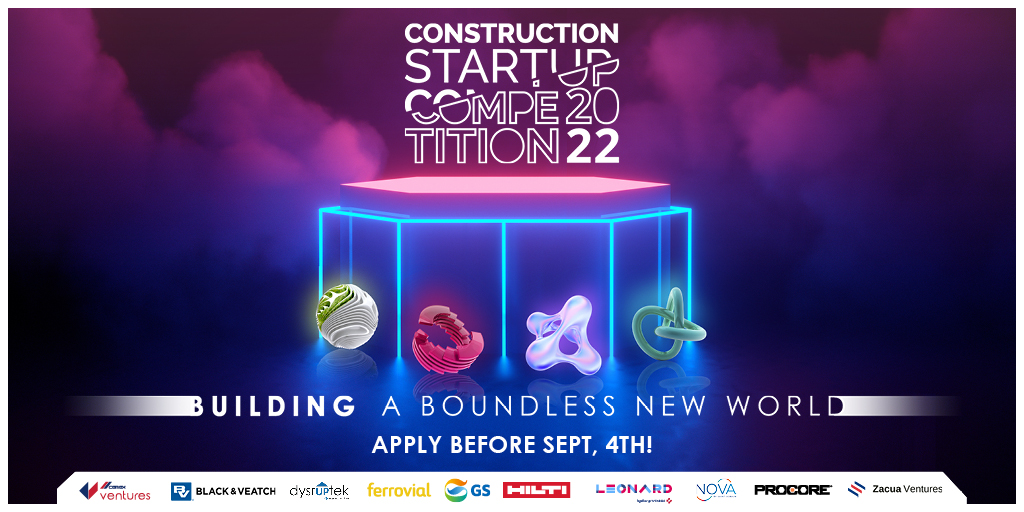 CEMEX Ventures partners again with leaders Dysruptek by Haskell, Ferrovial, GS Futures, Hilti, VINCI Group's Leonard, NOVA by Saint Gobain, and welcomes Black & Veatch, Procore Technologies, and Zacua Ventures. Construction Startup Competition 2022 looks for the strongest sustainability solutions, improving productivity and supply chain management, and building with innovative new methods and materials. The application phase will remain open until September 4, 2022.