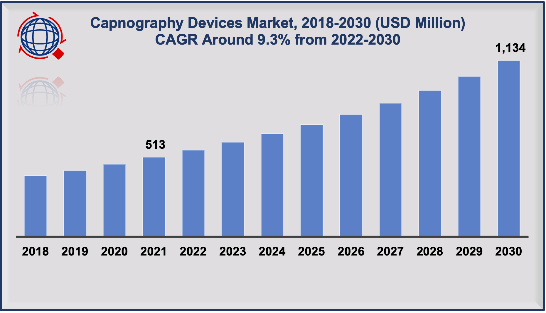 - Global capnography devices size accounted for US$ 513 million in 2021 and growing at a CAGR of 9.3% from 2022-2030