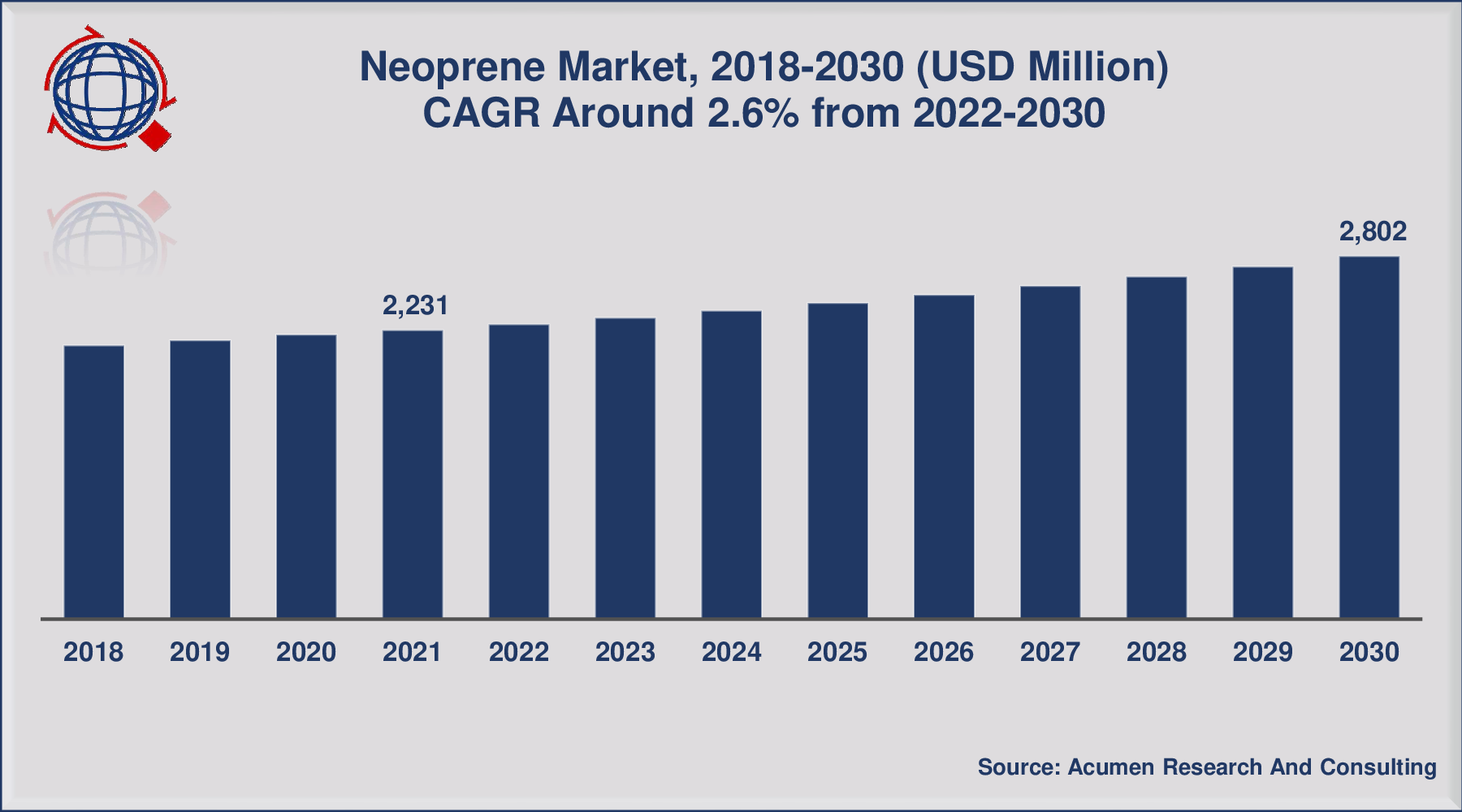 - Global neoprene market value was worth USD 2,231 million in 2021, with a 2.6% CAGR from 2022 to 2030