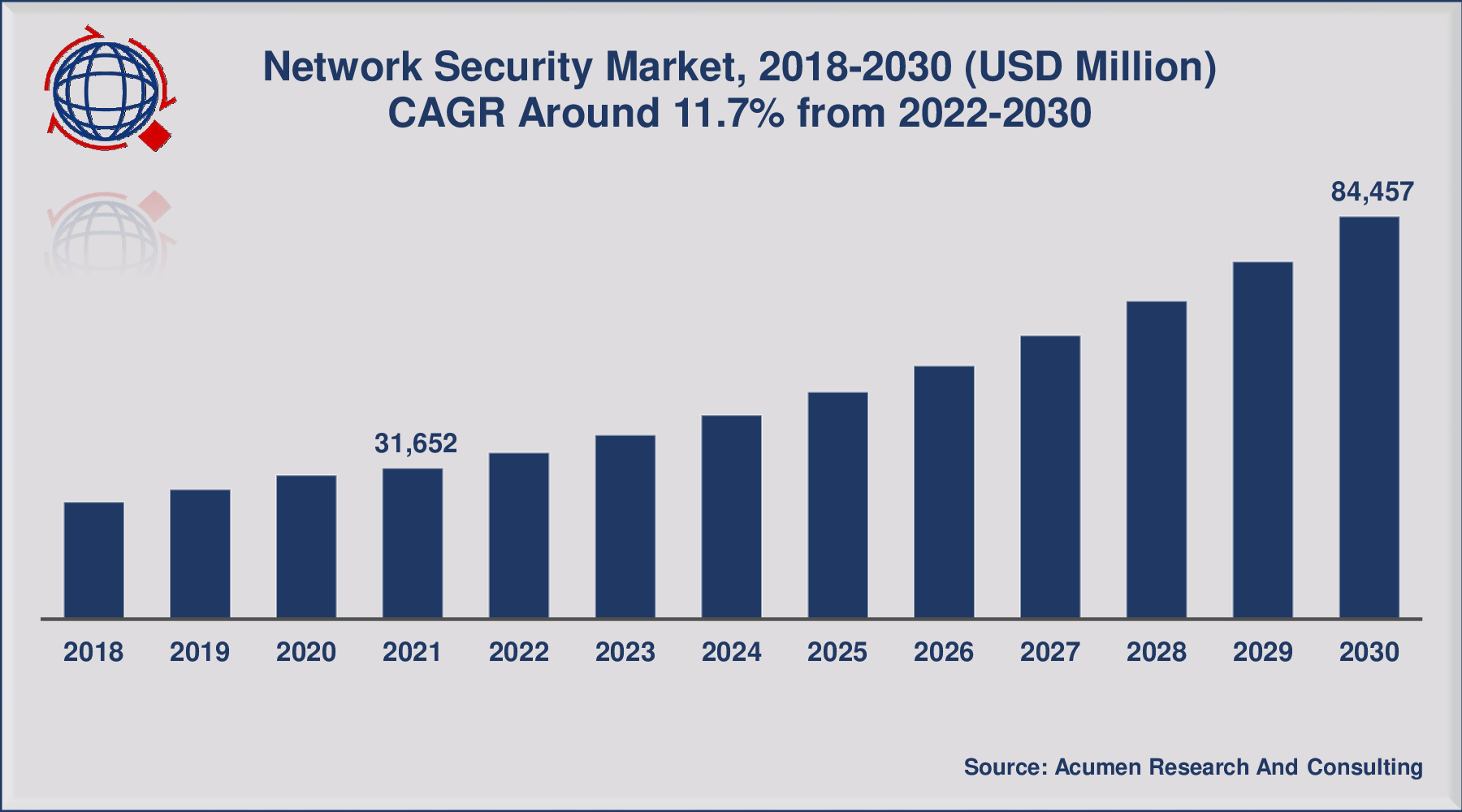 - Global network security market revenue was worth USD 31,652 million in 2021, with a 11.7% CAGR from 2022 to 2030