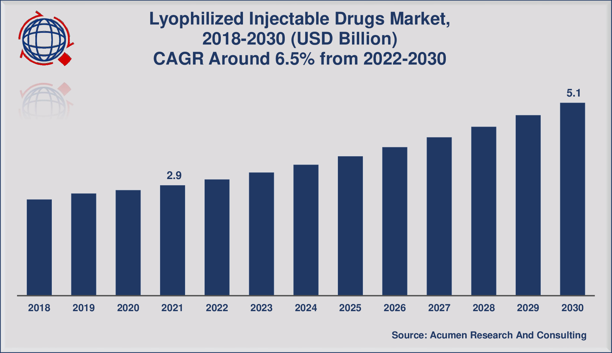 BERLIN, Nov. 30, 2022 (GLOBE NEWSWIRE) -- The Global Lyophilized Injectable Drugs Market Size accounted for USD 2.9 Billion in 2021 and is projected to occupy a market size of USD 5.1 Billion by 2030 growing at a CAGR of 6.5% from 2022 to 2030.