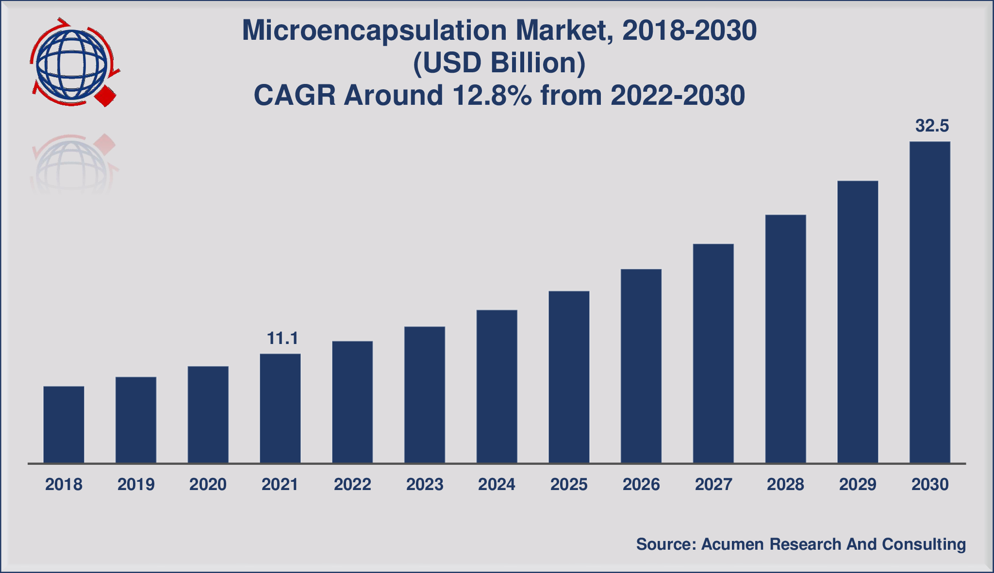 BEIJING, Nov. 10, 2022 (GLOBE NEWSWIRE) -- The Global Microencapsulation Market Size accounted for USD 11.1 Billion in 2021 and is projected to occupy a market size of USD 32.5 Billion by 2030 growing at a CAGR of 12.8% from 2022 to 2030.