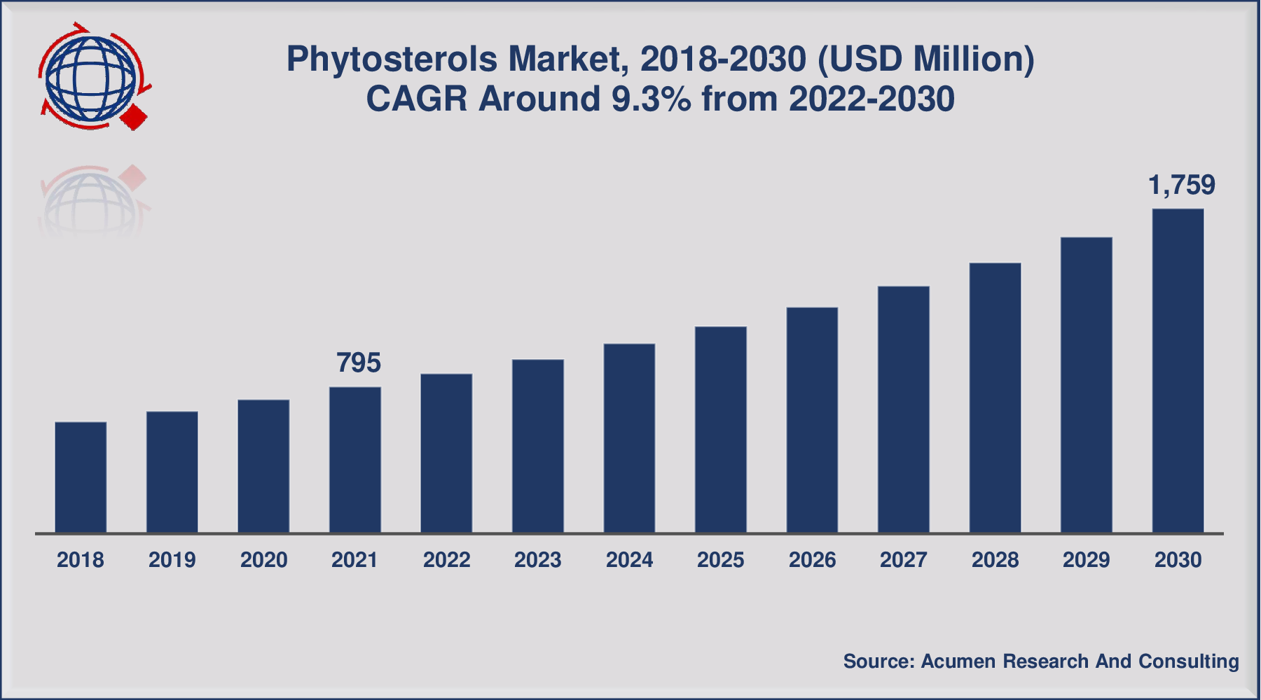 BEIJING, Dec. 14, 2022 (GLOBE NEWSWIRE) -- The Global Phytosterols Market Size accounted for USD 795.3 Million in 2021 and is projected to occupy a market size of USD 1,759.1 Million by 2030 growing at a CAGR of 9.3% from 2022 to 2030.