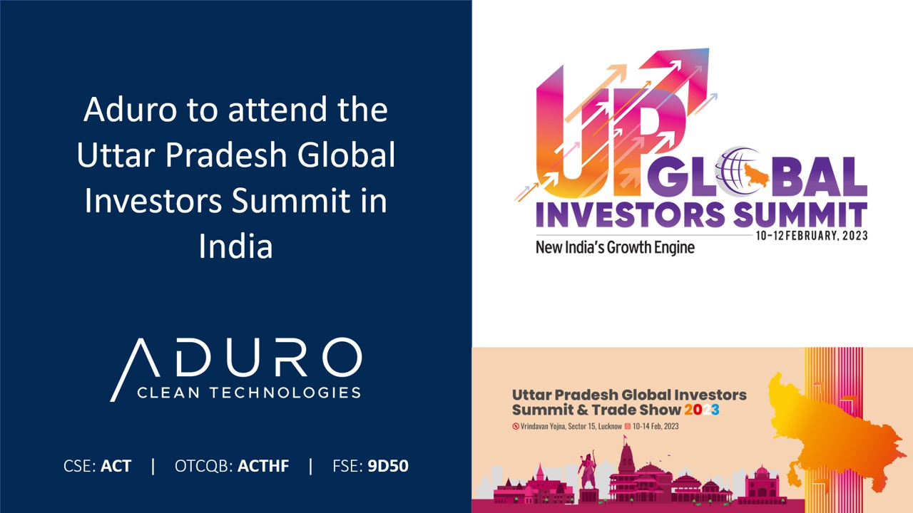 SARNIA, Ontario, Jan. 26, 2023 (GLOBE NEWSWIRE) -- Aduro Clean Technologies Inc. (“Aduro” or the “Company”) (CSE: ACT) (OTCQB: ACTHF) (FSE: 9D50), a Canadian developer of patented water-based technologies to chemically recycle plastics, and to transform heavy crude and renewable oils into new-era resources and higher-value fuels, is excited to announce its attendance at the upcoming Uttar Pradesh Global Investors Summit (UPGIS) 2023, scheduled for February 10-12 in Lucknow. The conference, which is a flagship event for the Government of Uttar Pradesh, India, will bring together policy makers, corporate leaders, business delegations, academia, think-tanks, and political and government leadership from across the globe to explore business opportunities and forge partnerships.