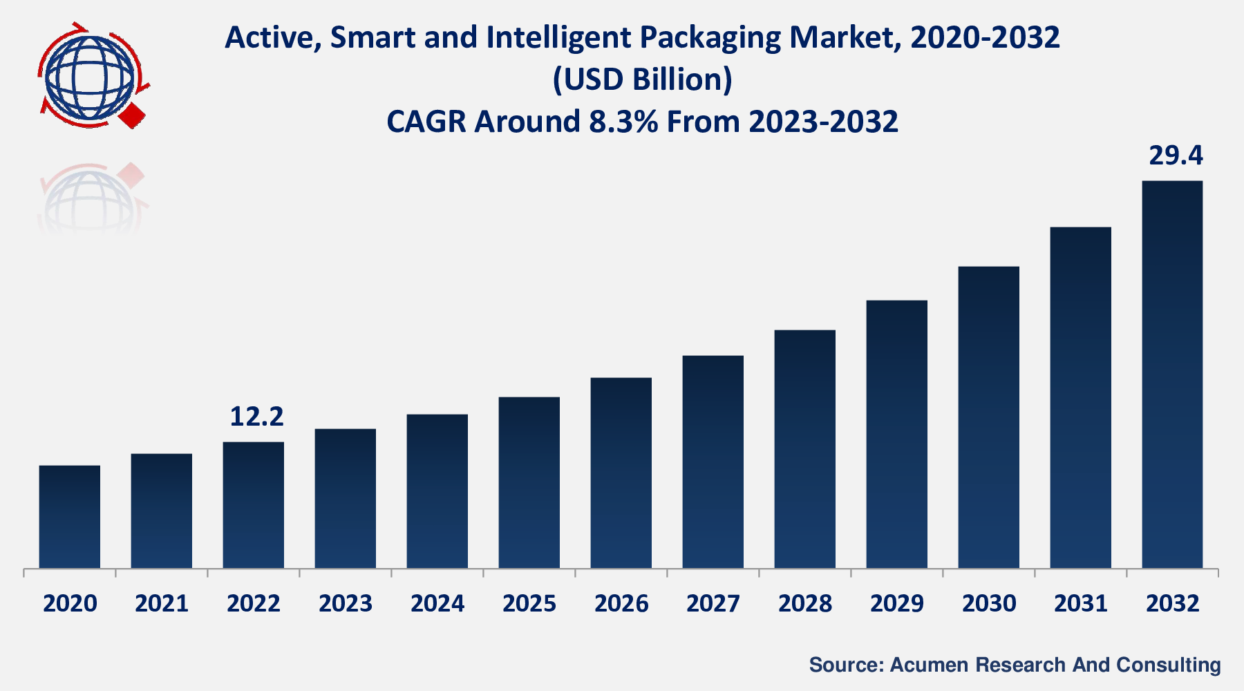 - The Global Active, Smart And Intelligent Packaging Market Size in 2022 stood at USD 12.2 Billion and is set to reach USD 29.4 Billion by 2032, growing at a CAGR of 8.3%