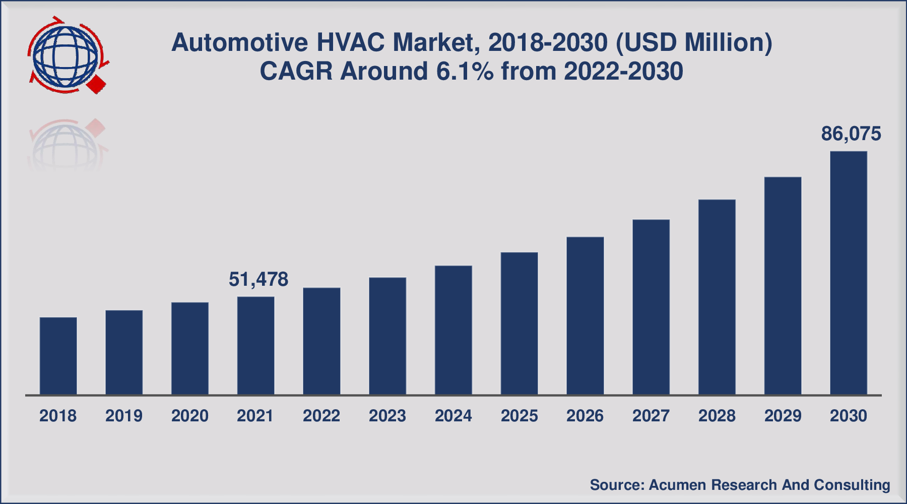 - The Global Automotive HVAC Market Size in 2021 stood at USD 51.478 Billion and is set to reach USD 86.1 Billion by 2030, growing at a CAGR of 6.1%