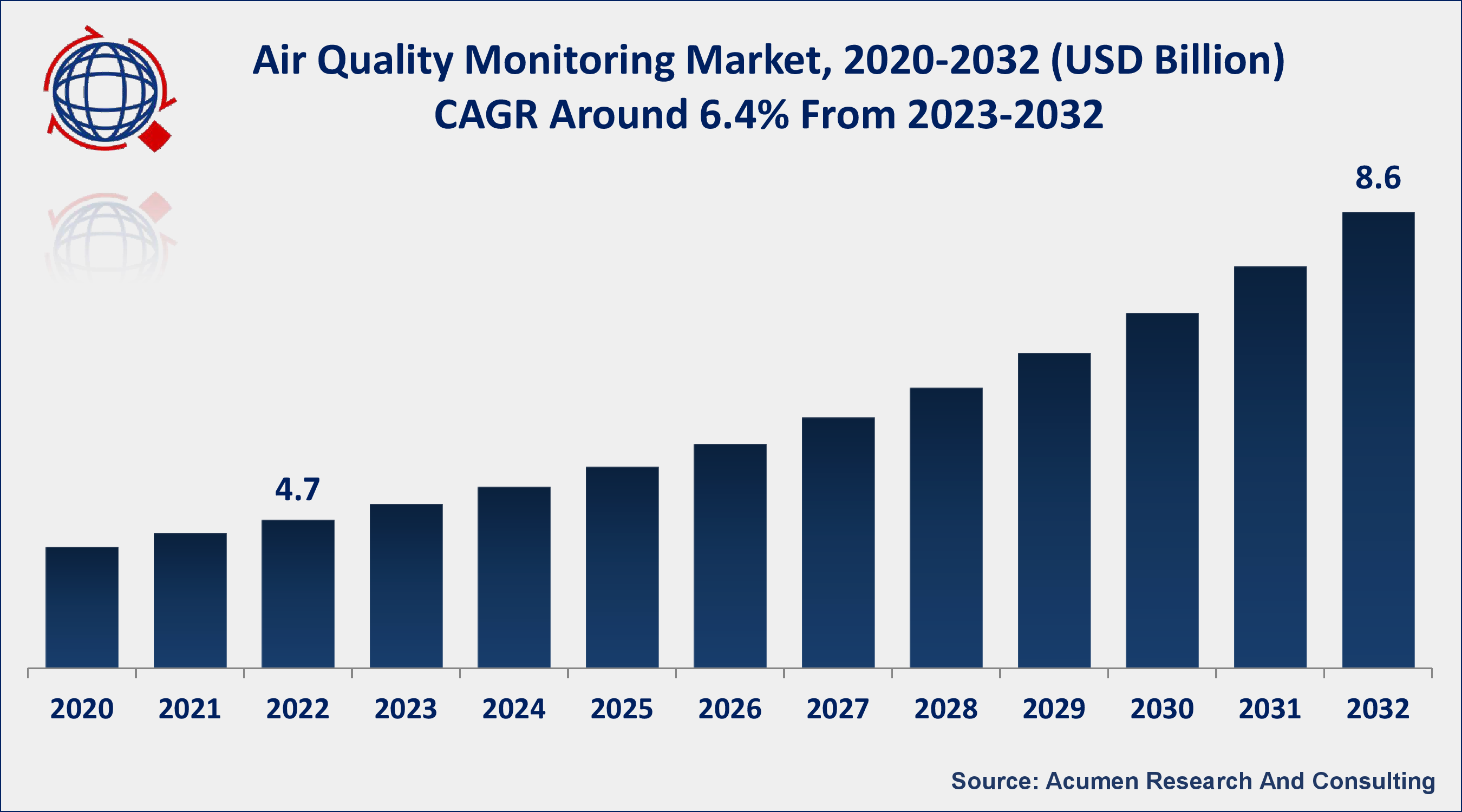 - The Global Air Quality Monitoring Market size in 2022 stood at USD 4.7 Billion and is set to reach USD 8.6 Billion by 2032, growing at a CAGR of 6.4%